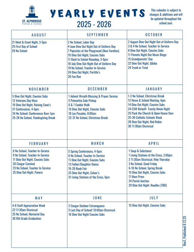 Tonight is our last summer Dine Out Night at Cousins Subs and we hope to see you there! Dine in or carry out from 3:00 to 8:00 p.m. at the Franklin location, 7700 S. Lovers Lane Road. 20% of the sales will go to support St. Alphonsus. Remember to get a receipt (one per child) so that your student can be out of uniform this fall.