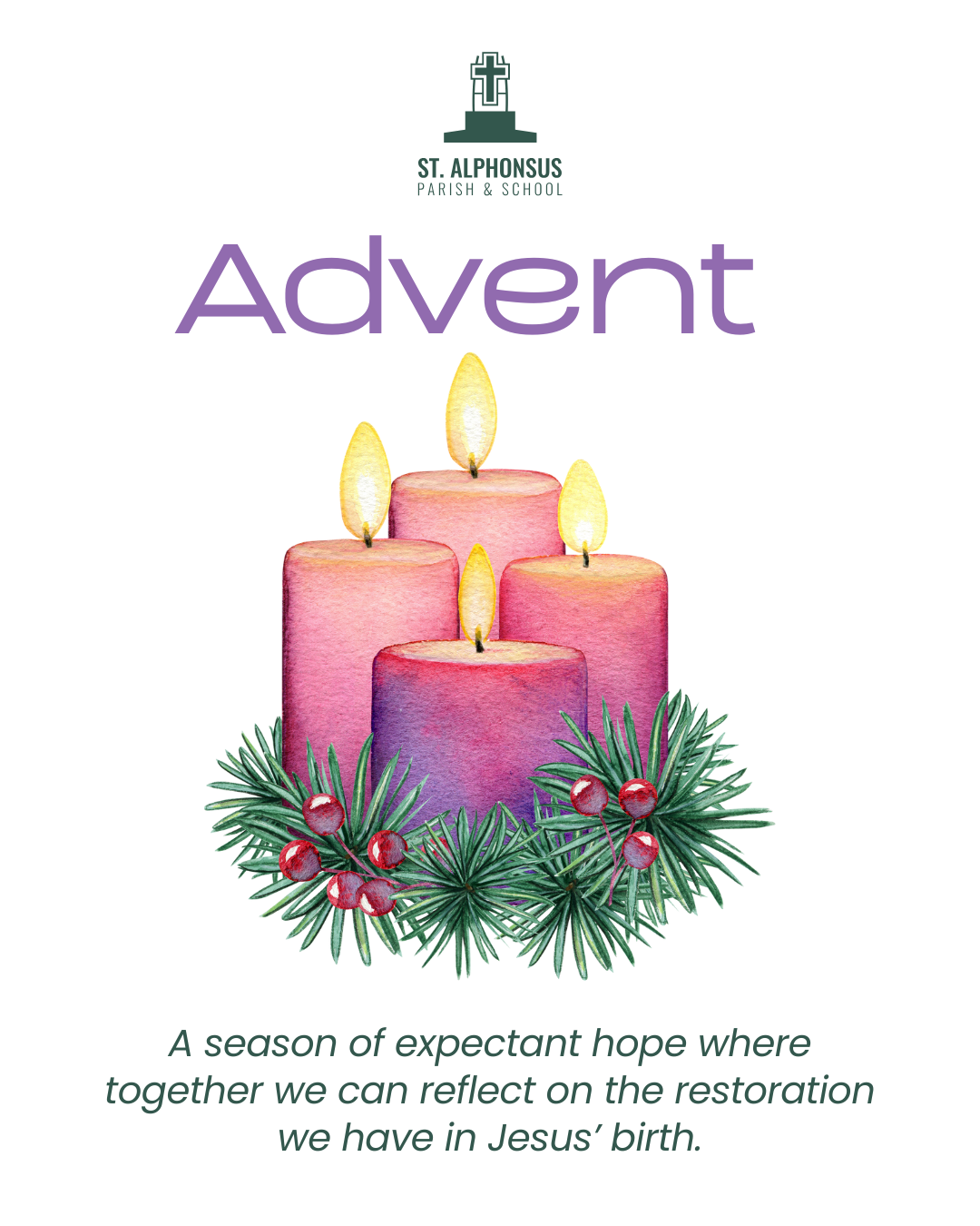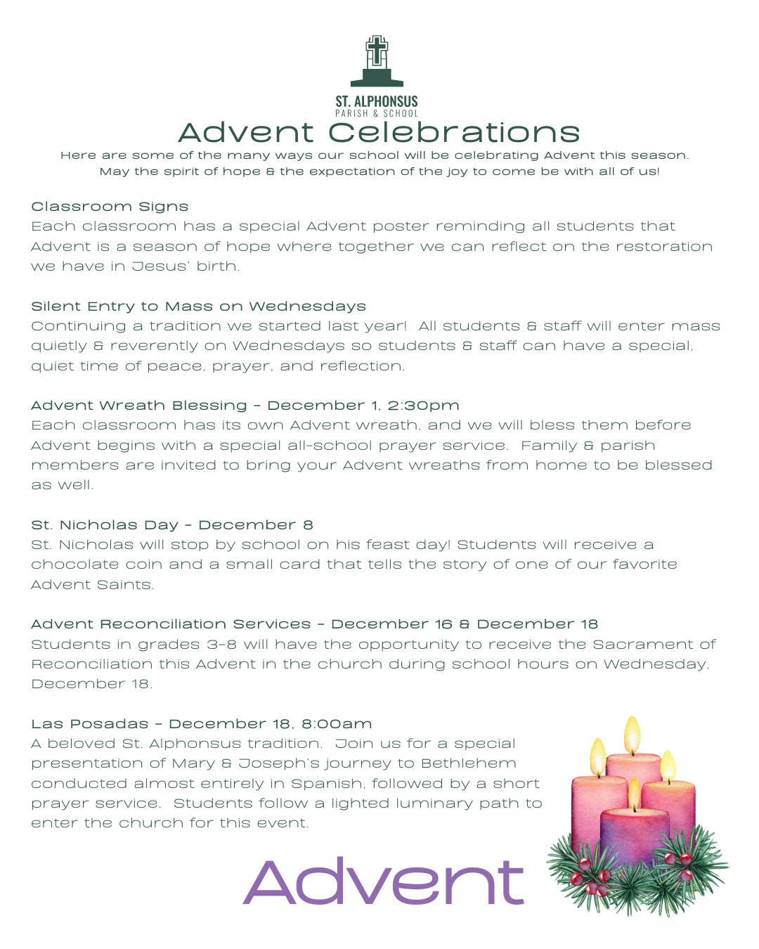 St. Alphonsus School will again be celebrating the season of Advent in various ways. You can find a flyer below that lists many of the school activities we have going on this season. Our picture at the top this week is this year's Advent flyers, which will be placed in all classrooms. If you would like a copy for yourself, please email Mrs. Schermetzler who will send you a PDF you can print at home.