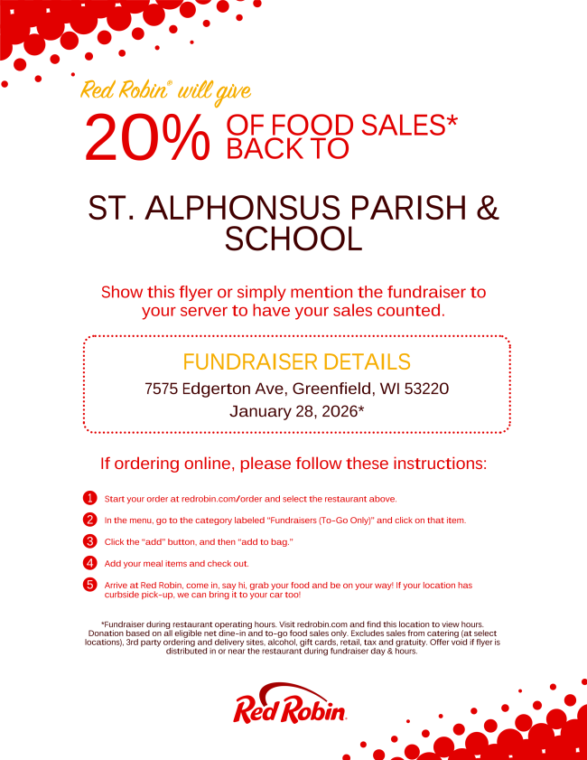 Dine in or carry out ALL DAY at the Greenfield location, 7575 Edgerton Avenue. Be sure to mention St. Alphonsus to your server when ordering in store or show the flyer (printed or on your phone) and 20% of the sales will go to support St. Alphonsus. You can also order online. Once you select the Greenfield location, look for “Fundraisers To Go” in the menu. Add that to your order so our school gets credit. Remember to get a receipt (one per child) so that your student can be out of uniform on Monday, February 2nd.