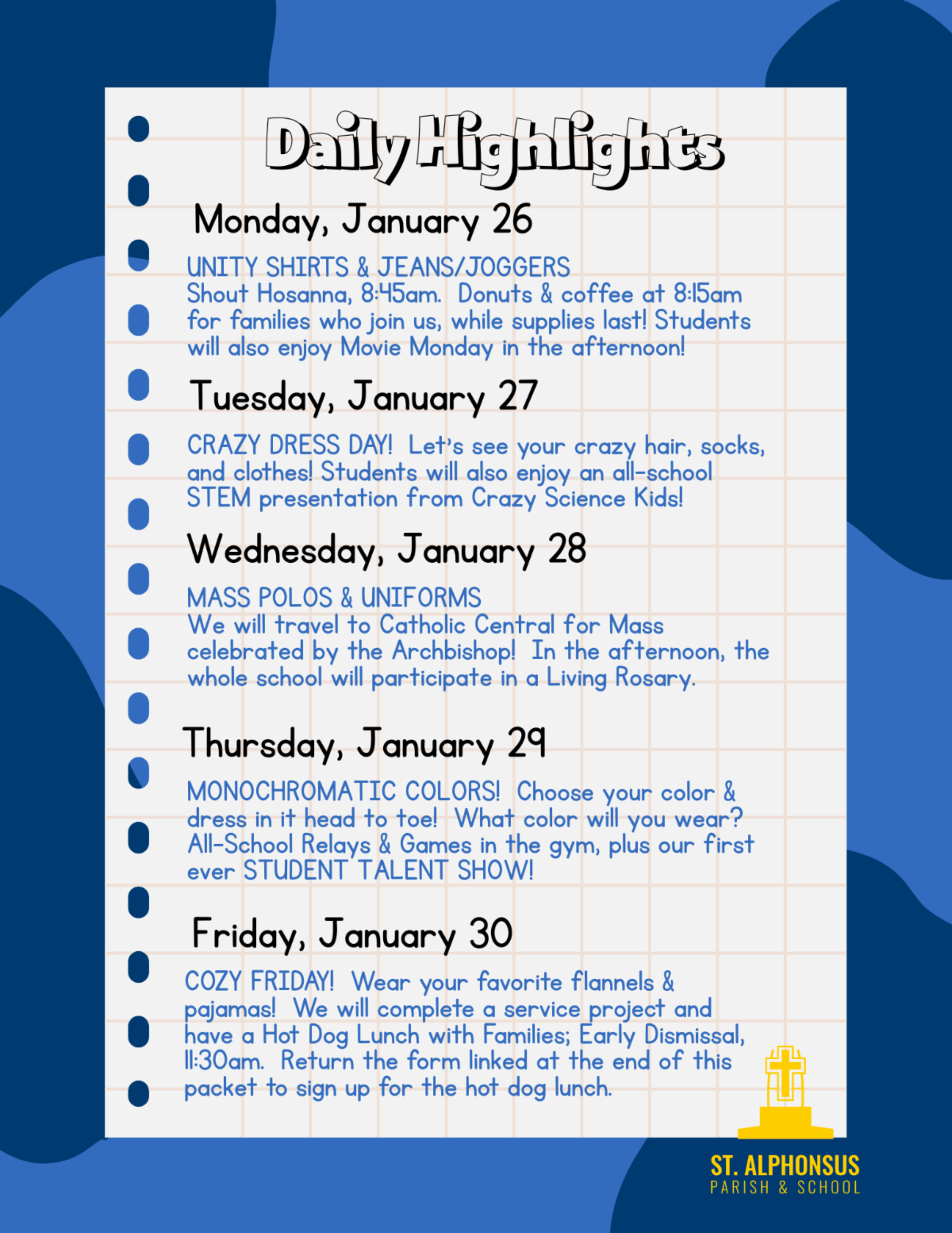 You can find more details about what we're up to this week to celebrate our Catholic School below. Thank you as always for choosing St. Alphonsus. Our school wouldn't be what it is without you, our families. We are so grateful for your love and support and hope we get to see you at a few of our events this week!