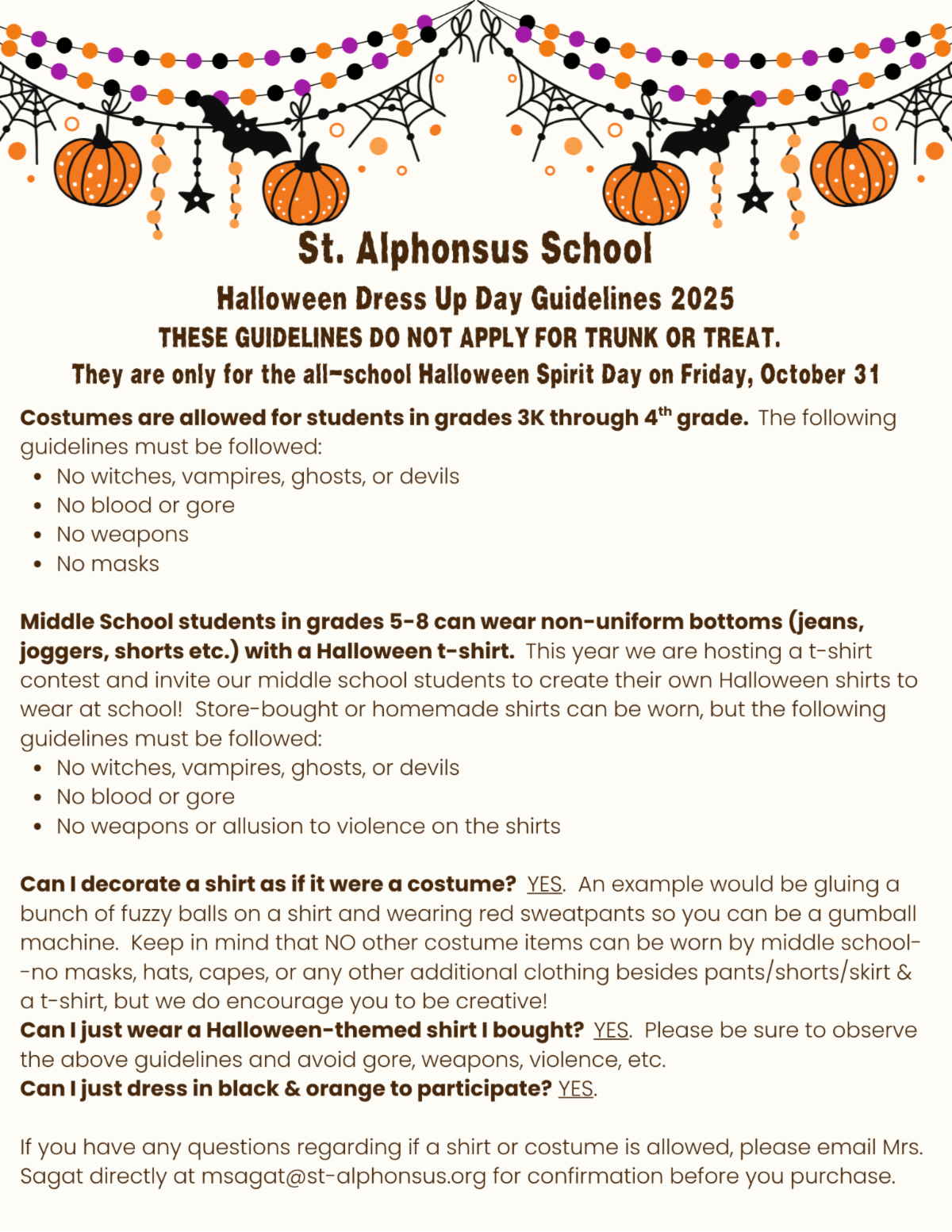 Friday, October 31, we will have a Halloween Spirit Day! Guidance on Halloween costumes is below. Please read carefully, and please also note that the Halloween costume guidance does NOT apply to costumes at Trunk or Treat. Feel free to reach out to me directly with questions.