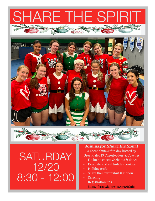 Greendale High School cheerleaders and coaches are hosting a “Share the Spirit” Cheer Clinic and Fun Day on Saturday, December 20, from 8:30 a.m. - 12:00 p.m. in the Greendale High School Gym for 1st through 6th graders. Click here to register or use the link in the flyer below!