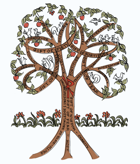 Pictured is the interactive Virtue Tree that helps students visualize how the virtues work together.
