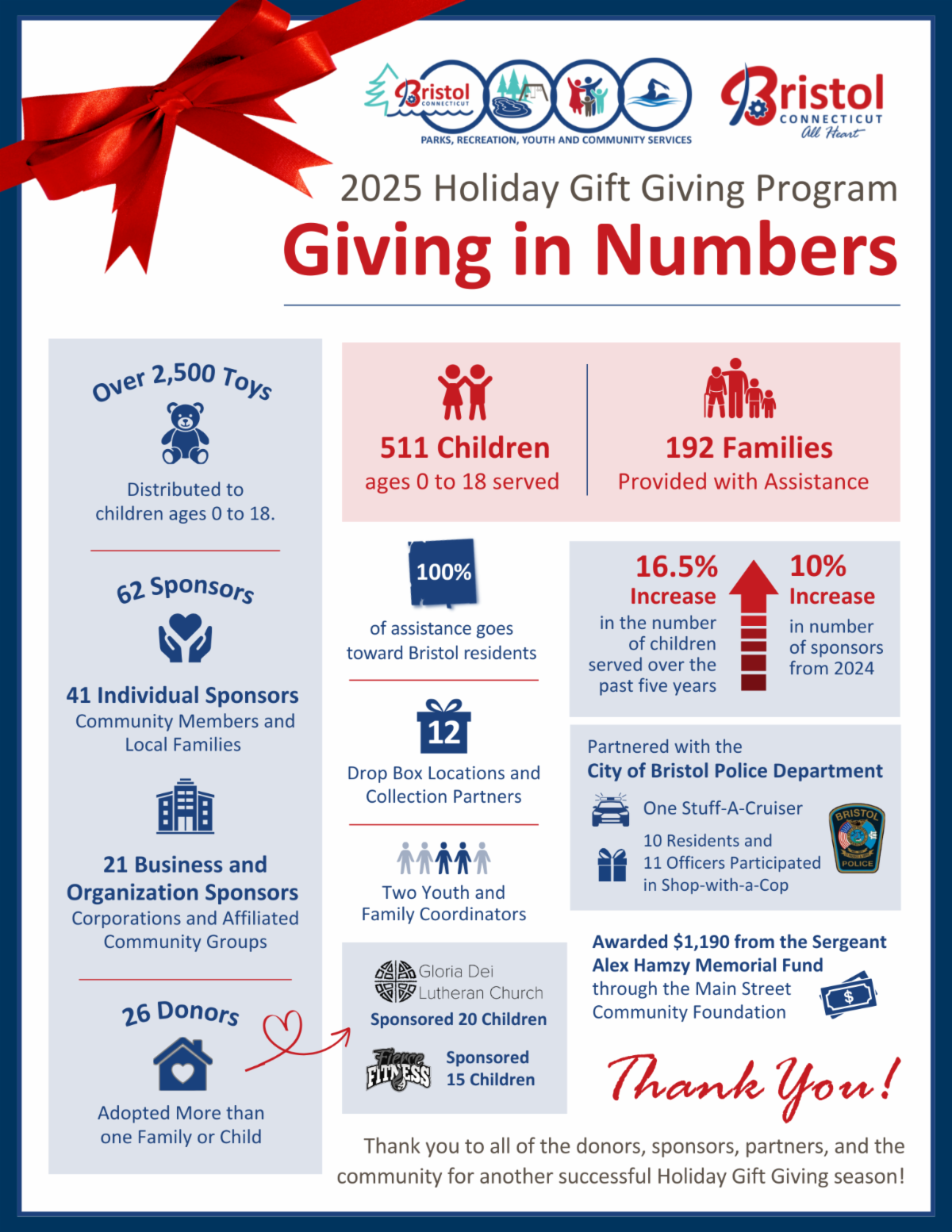 | | | Valentine's Day is soon to be upon us and and we're still basking in the love from this past holiday season! ❤️ We are extremely grateful to everyone who donated to the 2025 Holiday Gift Giving Program! Together, we were able to provide holiday assistance to 511 youth living directly in Bristol! Community members, sponsors, and local businesses donated toys, clothing, gift cards, their time, their energy and LOTS OF LOVE in 2025 - thank you for making Bristol All Heart! | | |