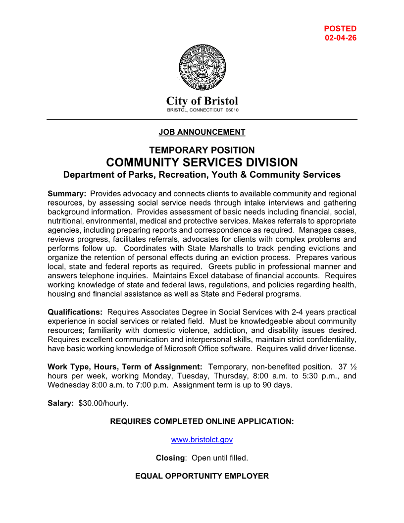 | | | | The Bristol Parks, Recreation, Youth and Community Services (BPRYCS) Office will be closed on Monday, February 16, 2026 in observance of Presidents Day. | | | | |