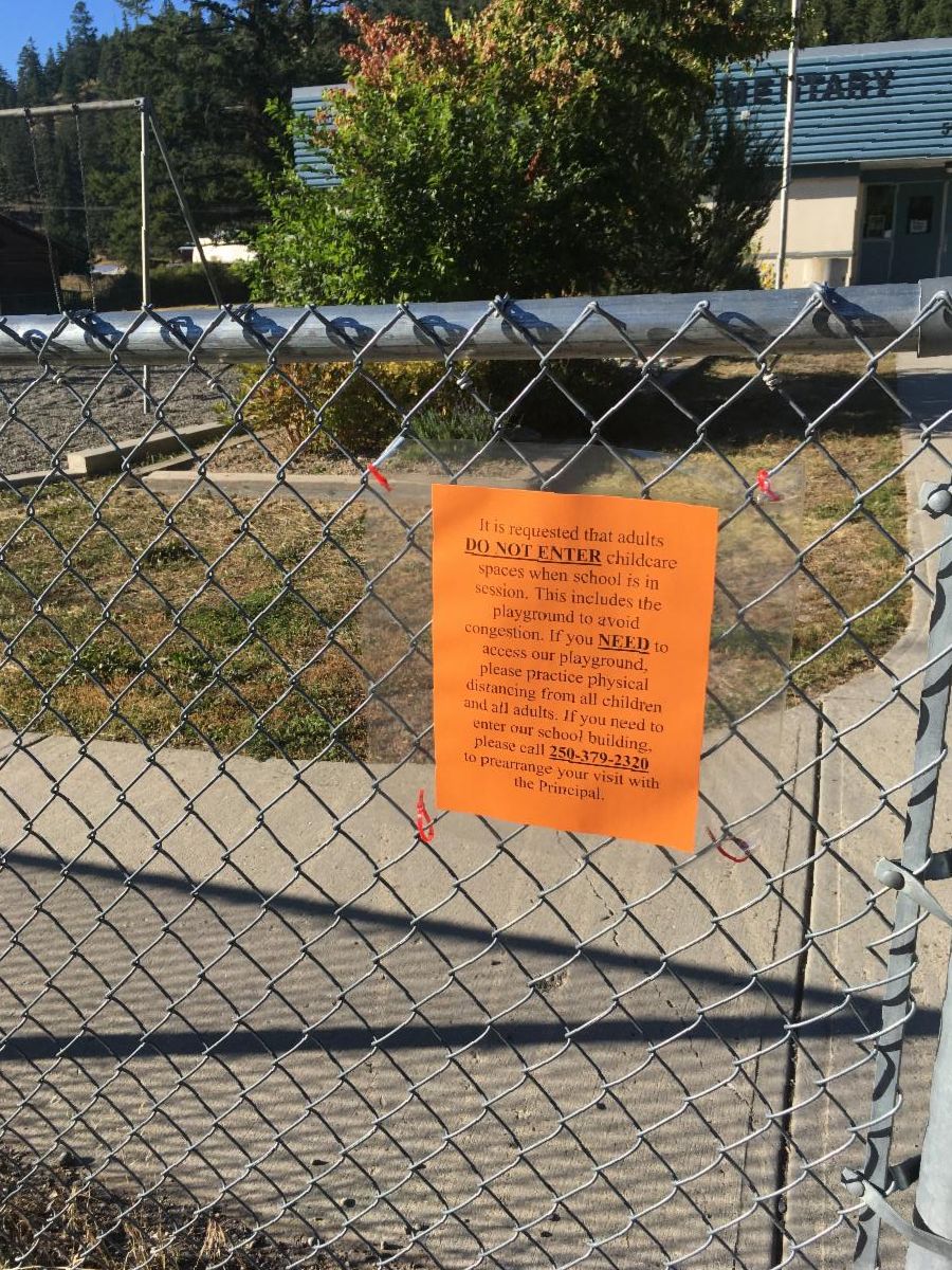 At this time, parents are asked to remain outside of child care spaces, including our playground. Signs, like that pictured, are at all entrances to our playgrounds. At drop off and pick up time, please ensure that you remain behind the fence and physically distance from others. If you feel you must enter (eg. late drop off or early pick up), please ensure you are physically distancing from all children (other than your own) and adults. If you would like to enter the building, please pre-arrange your visit with the Principal. 250-379-2320. Many thanks for your cooperation with this.