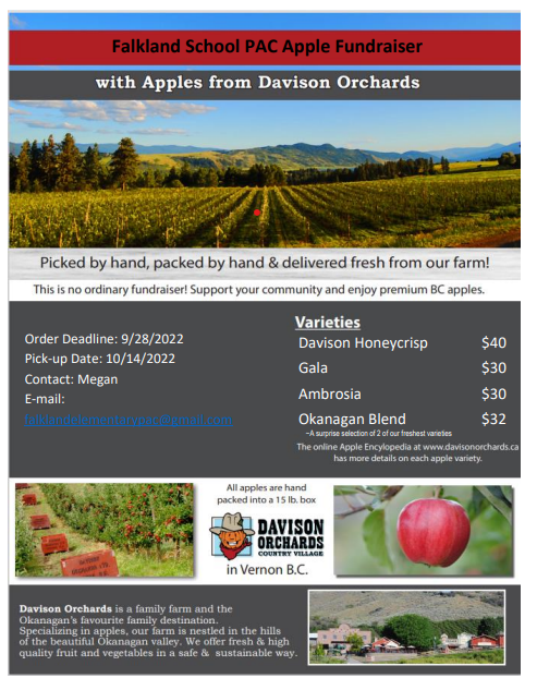 PAC has their first fundraiser of the school year already in motion with apples from Davison Orchards. Information will be sent home in the first week of school. Orders are due on Wednesday, September 28th and will be delivered on Friday, October 14th.