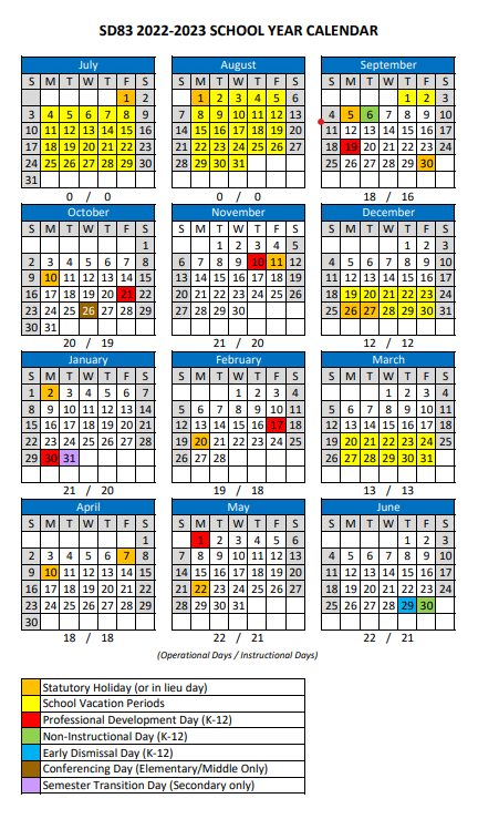 CLICK HERE to access the 2022-2023 SD 83 calendar containing statutory holidays and professional development days. Please ensure these important dates, including early dismissal (June 29 - 4 hours early) and our conferencing date (Wednesday, October 26) are in your family calendar. There is no school for students on the conferencing date.