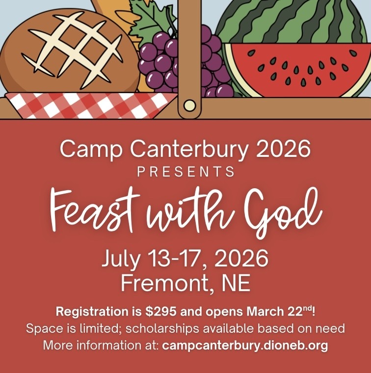 March 22nd is Camp Sunday, marking the first day of registration for Camp Canterbury from July 13th-17th at Calvin Crest Camp in Fremont, NE. All youth who are entering 4th through 12th grades are invited to join us for a faith and fun-filled week. Our theme this year is Feast with God, as we look at ways that we encounter God through the metaphor of food. For more information and to register on or after March 22, CLICK HERE.