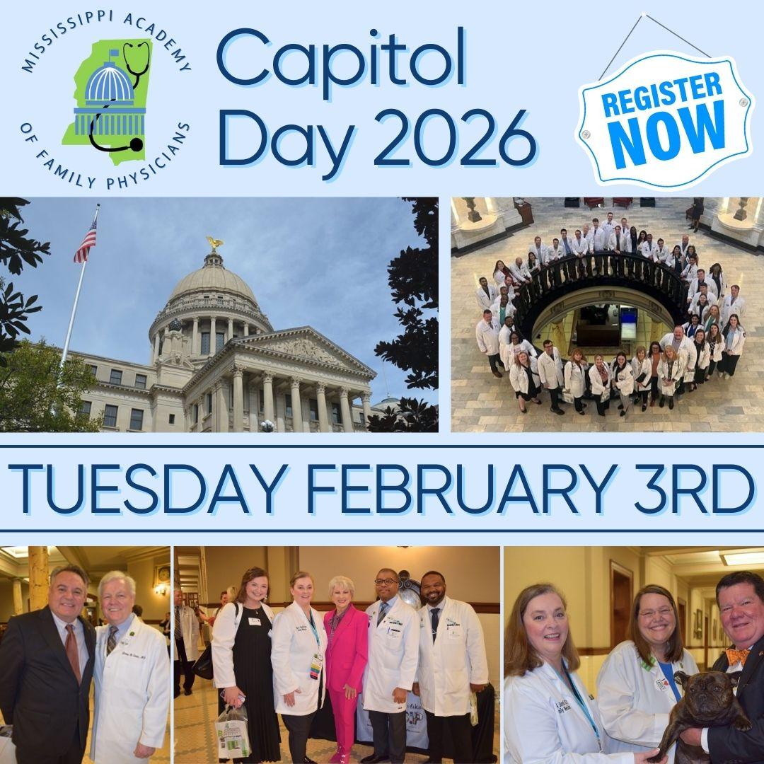 MAFP and the American Academy of Pediatrics Mississippi Chapter will host Primary Care Day at the Capitol on Tuesday, February 3, 2026, from 8am - 2pm. We are excited to combine our efforts to bring awareness to our specialties. Please wear your white coat and MAFP Membership pin. We will have pins at registration if you need one.