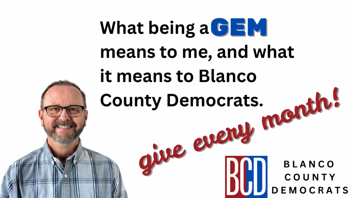 Being part of GEM feels empowering—my small monthly gift adds up to meaningful, sustained support, and I love knowing exactly how it helps fuel real local progress. If you're passionate about Democratic values in Blanco County, I highly recommend joining the GEM program.