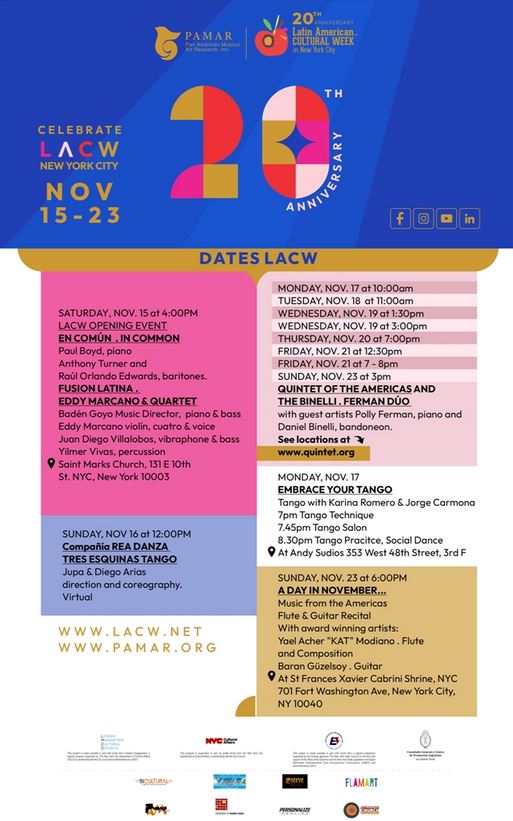| | (*) Esta sección incluye actividades vinculadas con la cultura argentina que tienen lugar en la región de Nueva York y otros estados de la jurisdicción del Consulado General, en cuya organización y contenidos el Consulado General no ha tenido ni tiene intervención y, por tanto, no resultan actividades que cuenten con el auspicio institucional del mismo. | |