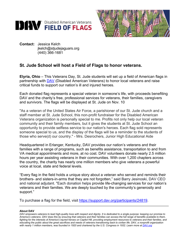 Please read this press release regarding the Field of Flags opportunity at St. Jude School this year.