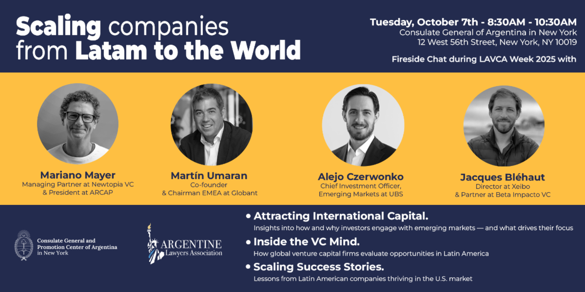 Durante la LAVCA Week 2025, que tendrá lugar en la ciudad de Nueva York del 7 al 9 de octubre, el Consulado General y Centro de Promoción de la República Argentina en Nueva York, junto con la Argentine Lawyers Association (ALA) y la Asociación Argentina de Capital Privado, Emprendedor y Semilla (ARCAP), organizan un evento especial en la sede del Consulado el martes 7 de octubre.
