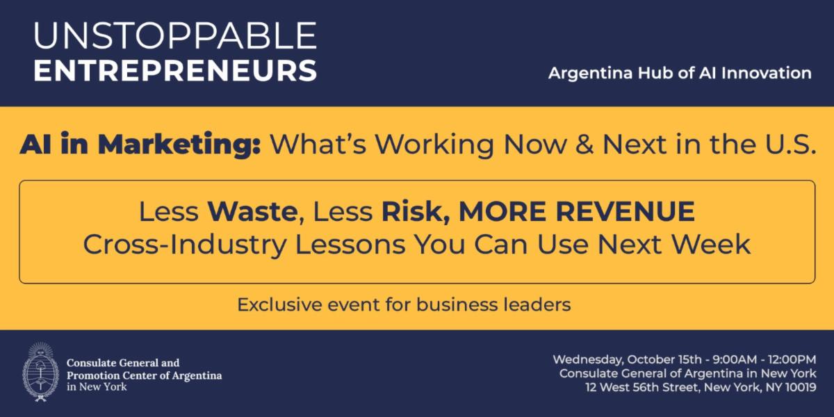 El 15 de octubre de 2025, el Consulado General y Centro de Promoción de la República Argentina en Nueva York presentará una nueva edición de su ciclo “Emprendedores Imparables”: “Menos desperdicio, menos riesgo, más ingresos: Lecciones de innovación cruzada para aplicar la próxima semana”.
