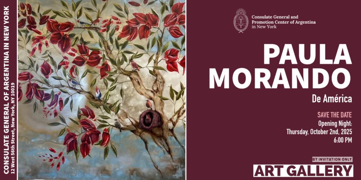 El Consulado General y Centro de Promoción de la República Argentina en Nueva York invita a disfrutar la muestra individual “De América”, una cautivadora serie de pinturas de la artista argentina Paula Morando que llama a reflexionar sobre los símbolos y emblemas de nuestra identidad colectiva. Desde el escudo nacional argentino y las plumas del hornero y el cóndor, hasta las flores de ceibo y la Virgen de Luján, las obras celebran elementos profundamente arraigados en la cultura argentina.