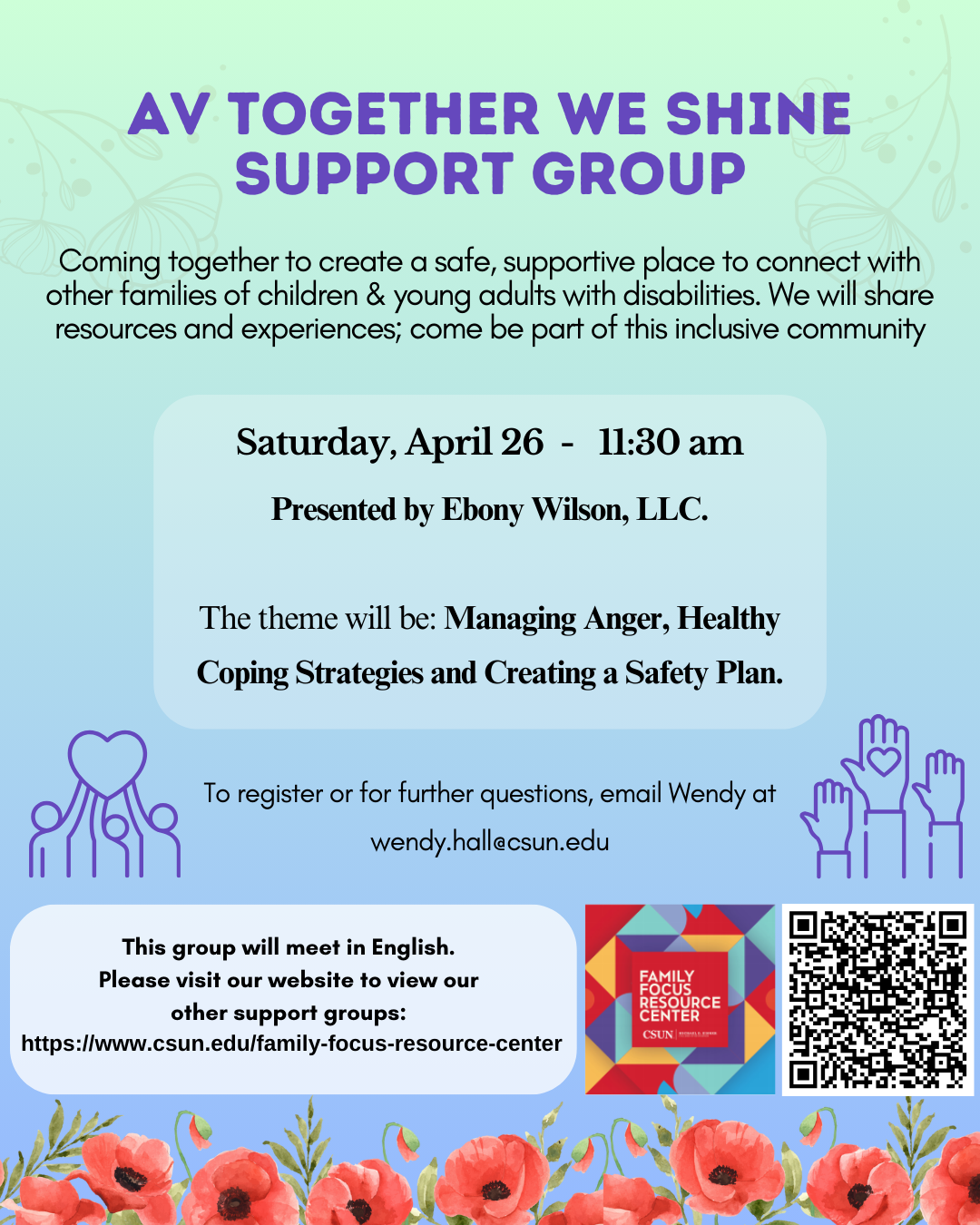 Join us for a support group just for parents and caregivers of adult North Los Angeles County Regional Center consumers. This group meets on the 3rd Wednesday of each month.