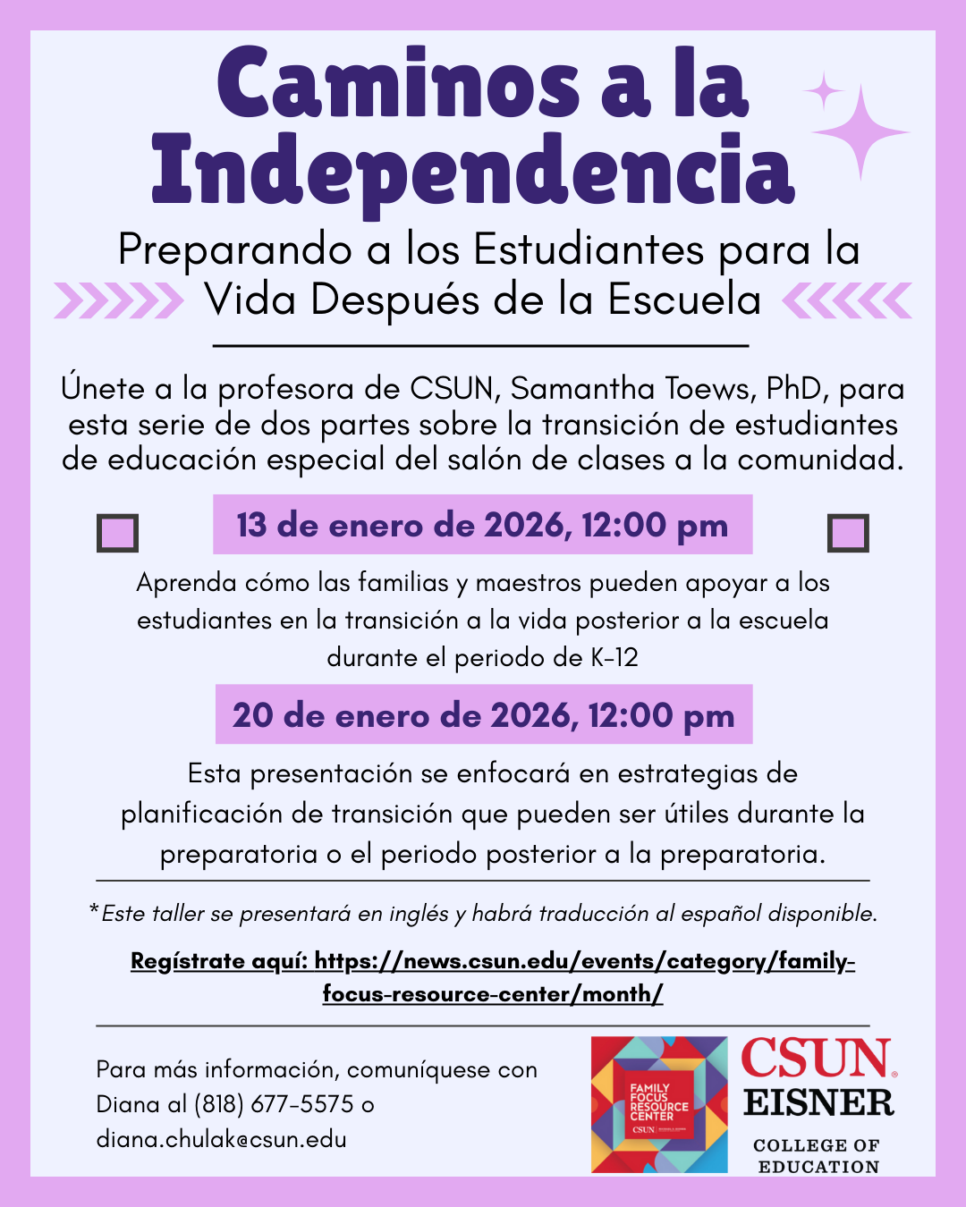 Únete a la profesora de CSUN, Samantha Toews, PhD, para una serie de dos talleres diseñados para ayudar a las familias y a los educadores a apoyar a los estudiantes con discapacidades en su transición del salón de clases a la comunidad.