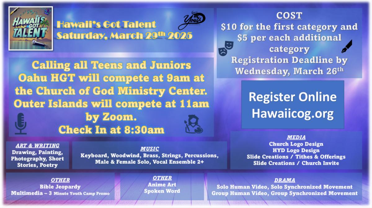 As we move forward, we are excited about what’s ahead! Hawaii’s Got Talent is just around the corner, giving our youth the opportunity to showcase their God-given gifts for His glory. And, of course, Youth Camp is on the horizon—a time for powerful encounters, life-changing moments, and memories that will last a lifetime. Keep these events in prayer, and if you feel led to get involved, we’d love to partner with you!