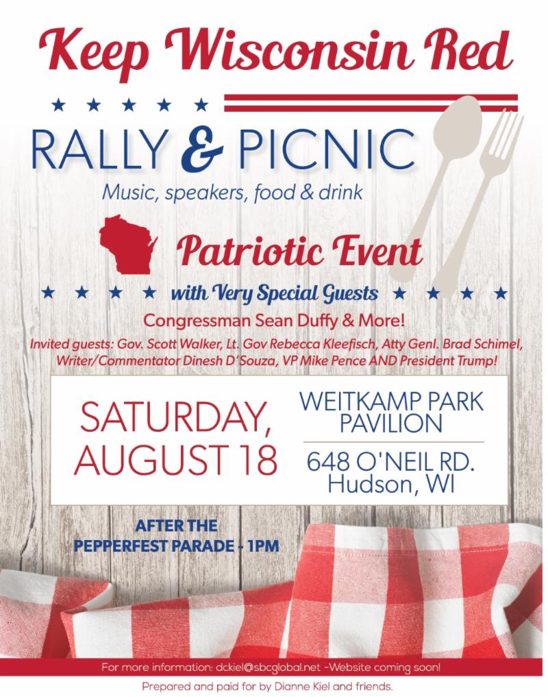 - August 18, 2018: Keep Wisconsin Red! Weitkamp Park, Hudson. Contact Dianne Kiel at: dckiel@sbcglobal.net. Music and food begins about 12:30, with special attention for our veterans. Dinesh D'Souza and U.S. Rep. Sean Duffy confirmed speakers