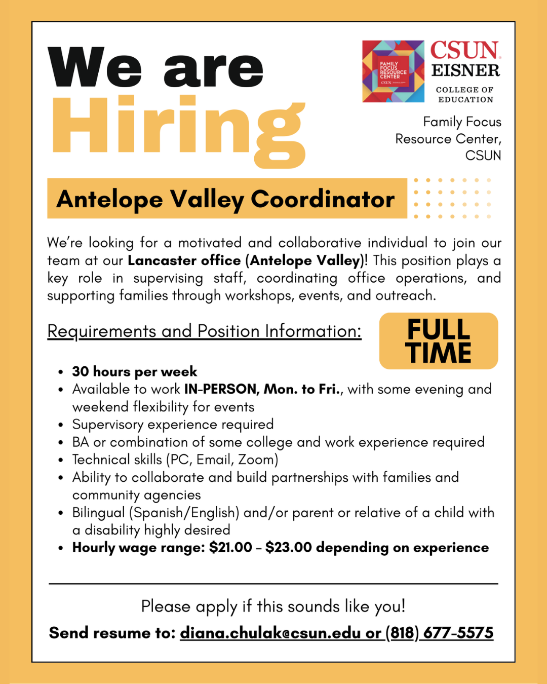 For more information, please contact Diana at diana.chulak@csun.edu or call