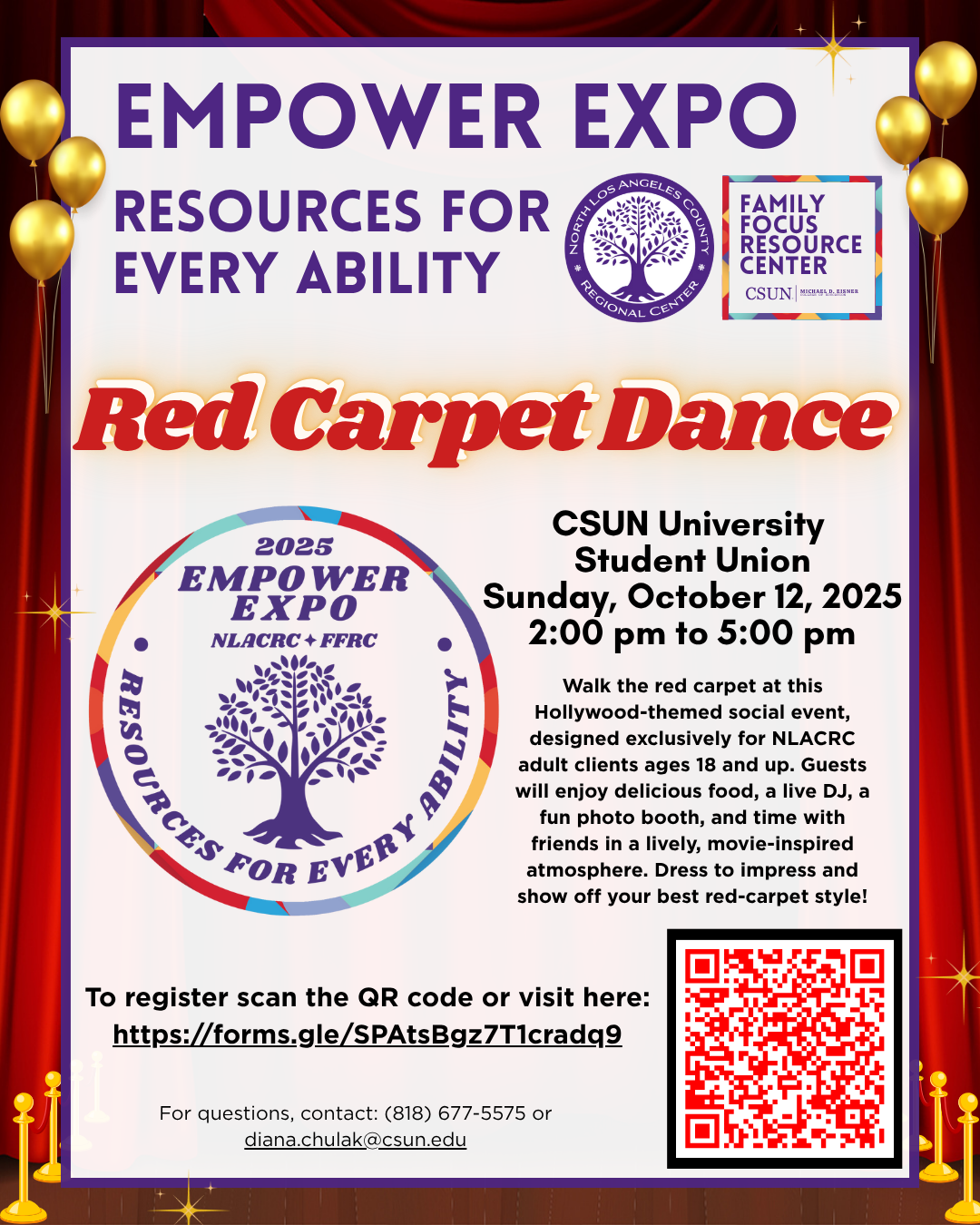Get ready to step into the spotlight! This special Hollywood-themed Empower Expo mixer / dance is exclusively for NLACRC clients ages 18 and older. Walk the red carpet, enjoy delicious food, dance to the beats of our DJ, capture memories at the photo booth, and have fun with friends in a lively, movie-inspired setting. Dress to impress and bring your best red carpet style! Please complete this form to confirm your attendance and help us create a fantastic experience for all our guests.