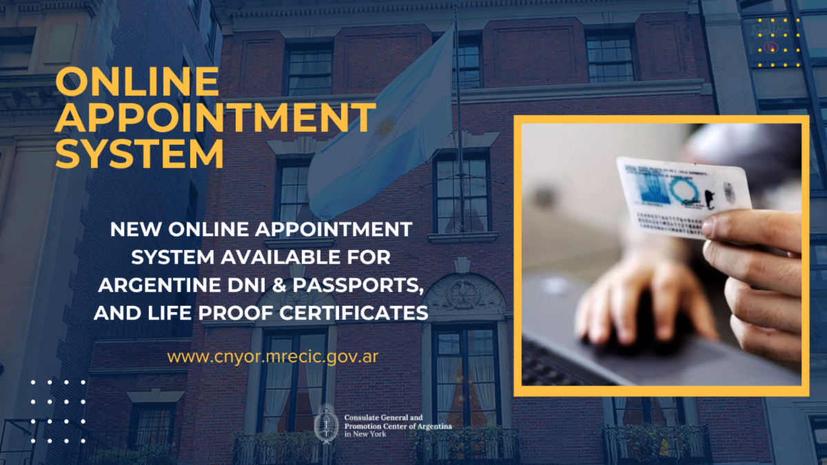 The Consulate General of Argentina in New York is pleased to announce that it has now extended its new online appointment system to include Proof of Life certificates (remote processing - Certificados de Supervivencia remotos), following an initial phase focused on DNI and passport services.