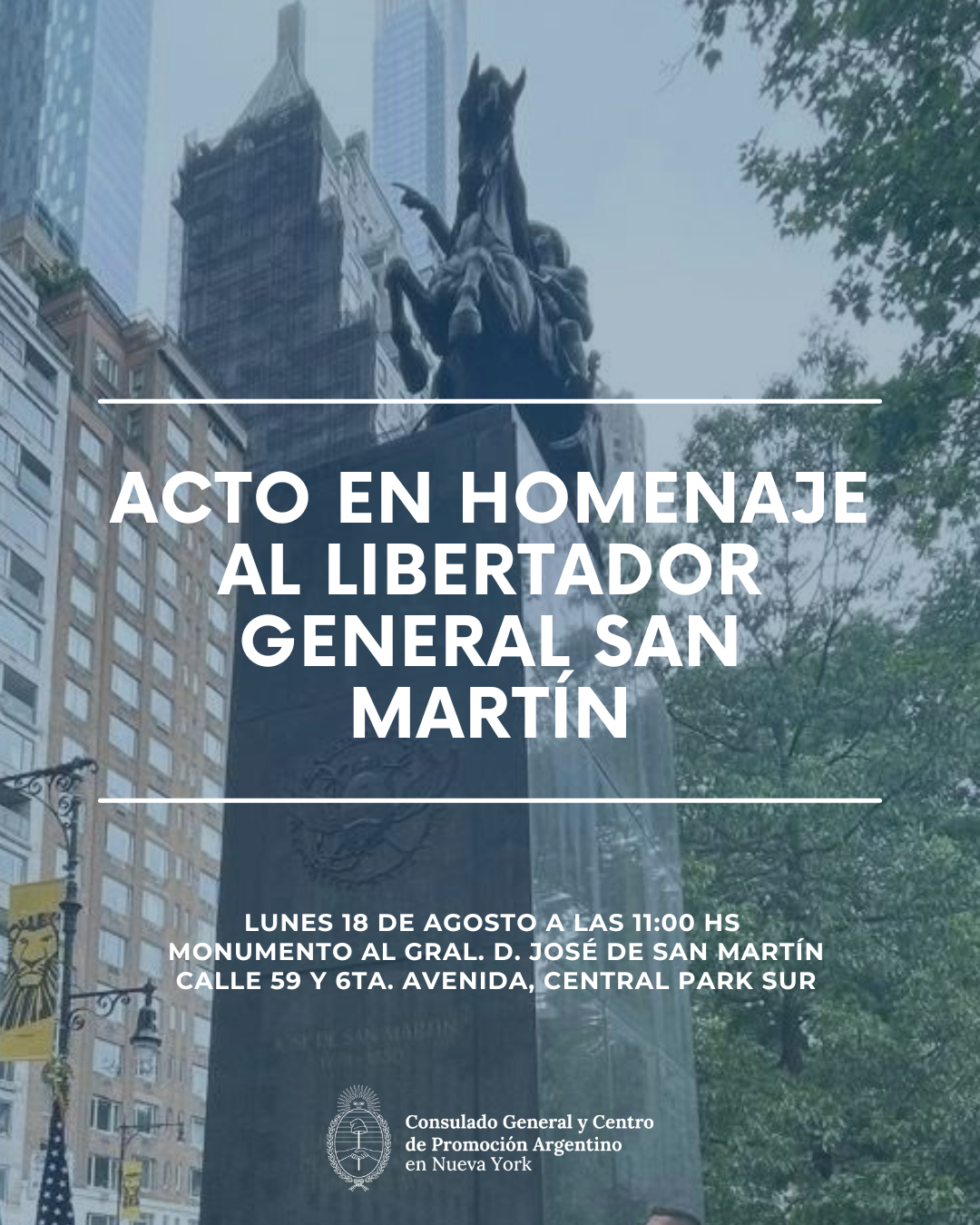 The Consulate General and Promotion Center of the Argentine Republic in New York cordially invites the Argentine community and friends of Argentina to join us for the commemorative ceremony marking the 175th anniversary of the passing of General José de San Martín, Father of our Nation.