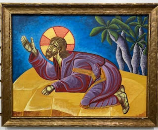 This wonderful painting was recently acquired and given to Northminster to join our permanent art collection. It is fitting to introduce it tonight on Maundy Thursday because it represents Jesus praying in agony in the Garden of Gethsemane on the night following the Last Supper with his disciples. Here is what the artist says about the painting.