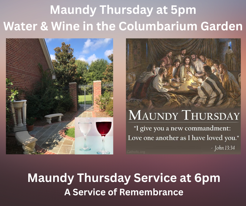 | | Please join us today at 5 pm for wine and water in the Northminster Columbarium Garden (weather permitting) and then at 6 pm for our Maundy Thursday service in the sanctuary. | |