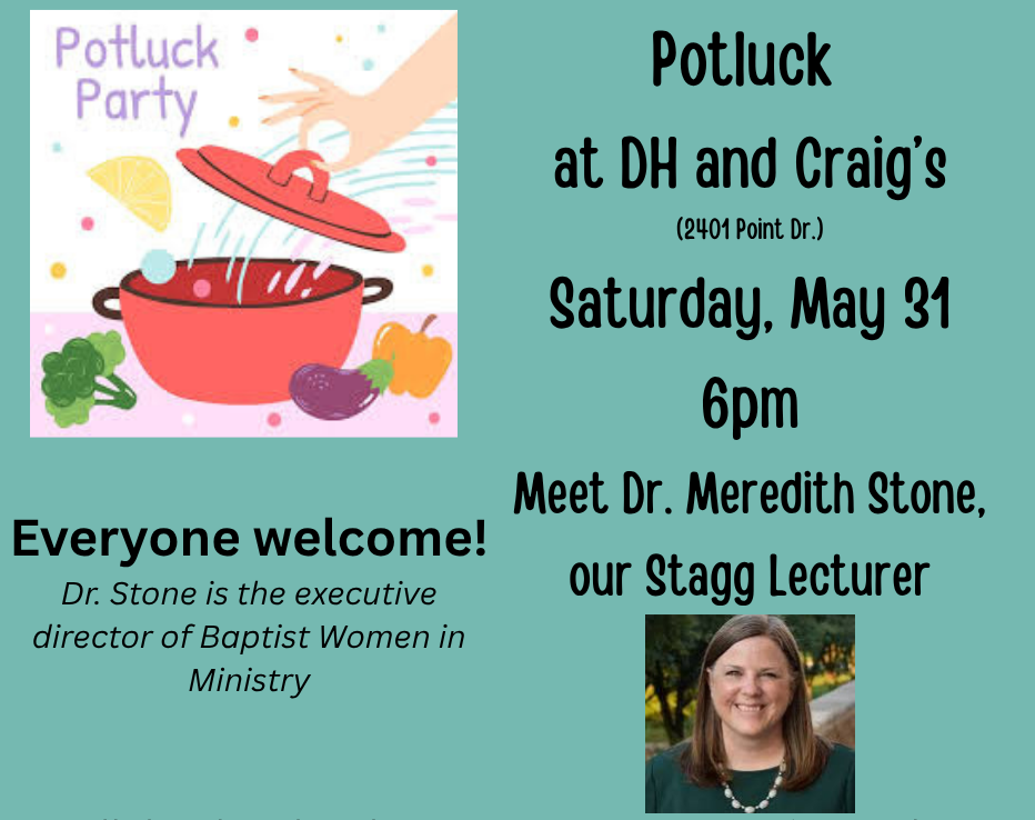 This coming Saturday morning, May 31, Rev. Dr. Meredith Stone will present the Frank and Evelyn Stagg Lectures in Prophetic Christianity at Northminster. Dr. Stone is the Executive Director of Baptist Women in Ministry. Her lectures are entitled “Prophetically Responding to Christian Patriarchy in the US Today”. Beginning at 10:00 am there will be two lectures of about forty-five minutes each with a pause for refreshments between the lectures. The lectures should end by noon. There will be a time for coffee, juice and breakfast goodies beginning at 9:15 am. The lectures will also be live streamed and archived on Northminster’s YouTube channel. Dr. Stone will also preach in our service of worship on Sunday, June 1.