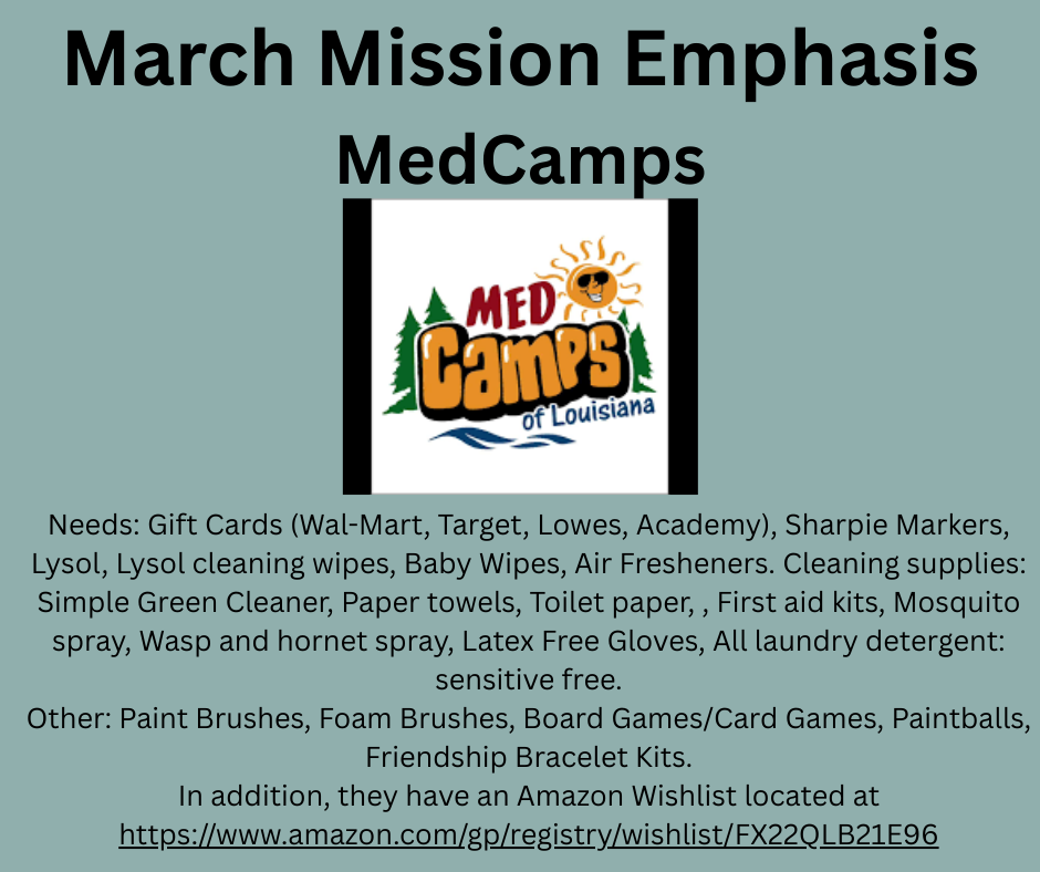This Saturday, March 21 from 9am – 11am Mission outing to the Ouachita Parish Animal Shelter. All are encouraged and invited to take part in this mission activity. See sign-up sheet in the hall. The shelter is located at 417 Well Road, West Monroe, LA