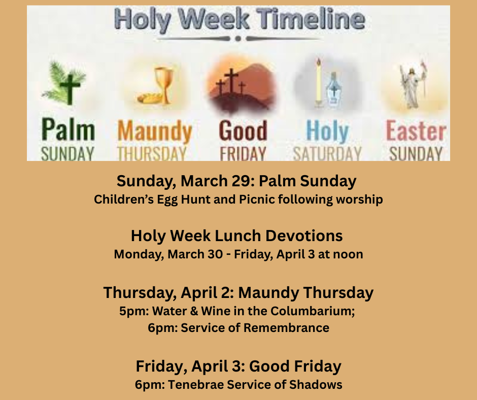 PLEASE SEE THE HOLY WEEK LUNCH SIGN UP SHEET IN THE HALL TO NOTE YOUR PLANS TO ATTEND. A GENERAL COUNT IS NEEDED SO HOSPITALITY WILL KNOW HOW MUCH FOOD TO PROVIDE!