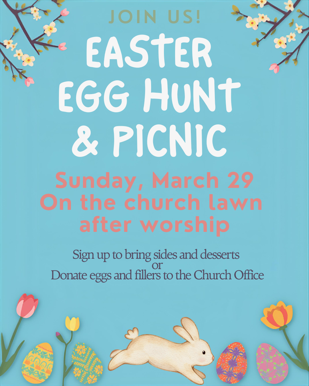 PLEASE SEE THE PICNICH SIGN UP SHEET IN THE HALL. SIDES AND DESSERTS ARE NEEDED FOR THIS EVENT WHICH IS SUNDAY, MARCH 29!!