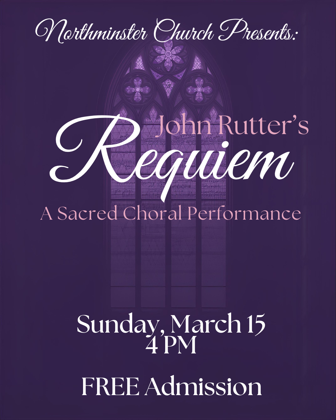 On Sunday, March 15 at 4 PM, the Northminster Choir and friends will present a moving performance of Requiem by John Rutter at Northminster Church. Conducted by Dr. Deborah Chandler, the concert will feature choir, chamber orchestra, and organ in a powerful and reflective musical experience.