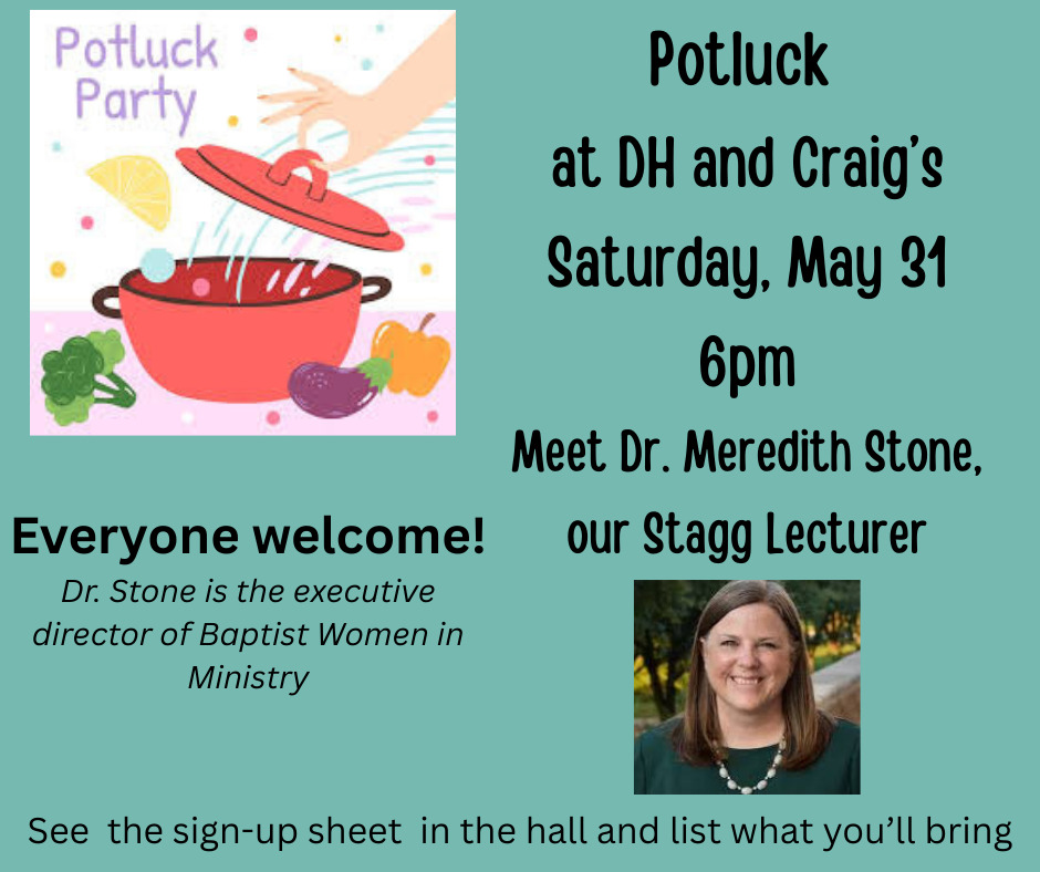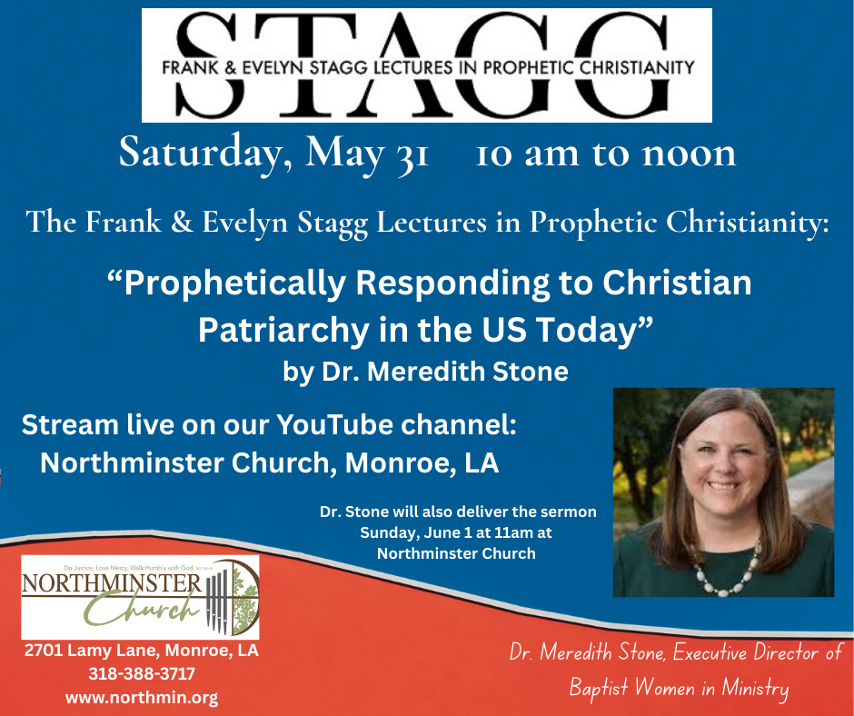Our second opportunity will be on Saturday morning, May 31 when Rev. Dr. Meredith Stone will present the Frank and Evelyn Stagg Lectures in Prophetic Christianity at Northminster. Dr. Stone is the Executive Director of Baptist Women in Ministry. Her lectures are entitled “Prophetically Responding to Christian Patriarchy in the US Today”. Beginning at 10:00 am there will be two lectures of about forty-five minutes each with a pause for refreshments between the lectures. The lectures should end by noon. There will be a time for coffee, juice and breakfast goodies beginning at 9:15 am. The lectures will also be live streamed and archived on Northminster’s YouTube channel. Dr. Stone will also preach in our service of worship on Sunday, June 1.