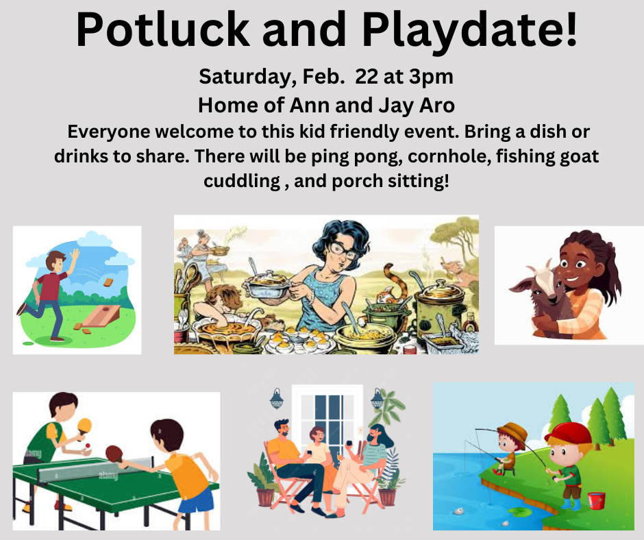 Join us for a casual potluck and play date at the Aro home (1295 Winnfield Rd., West Monroe) on February 22nd at 3pm. There will be ping pong, cornhole, fishing, goat cuddling, and porch sitting. All are welcome, and this is a very kid friendly event. Bring a food or drink item to share. Contact Ann Aro with any questions (832-859-9156).