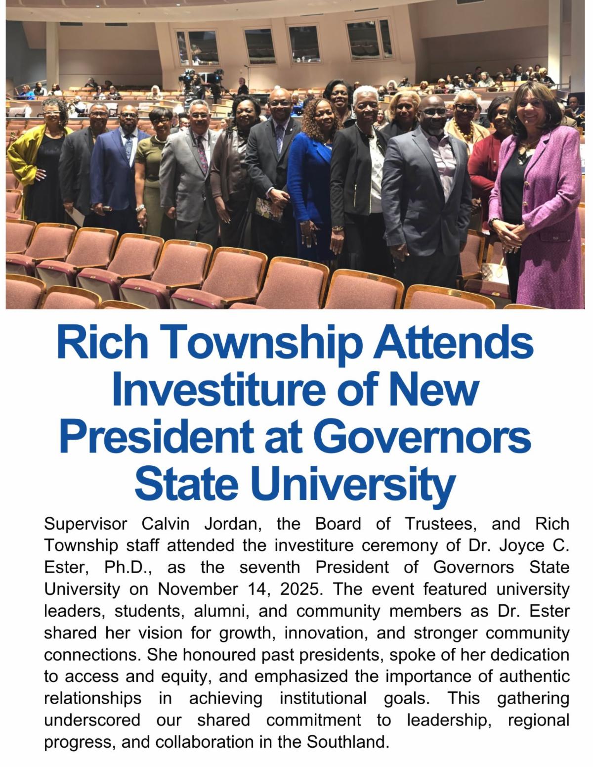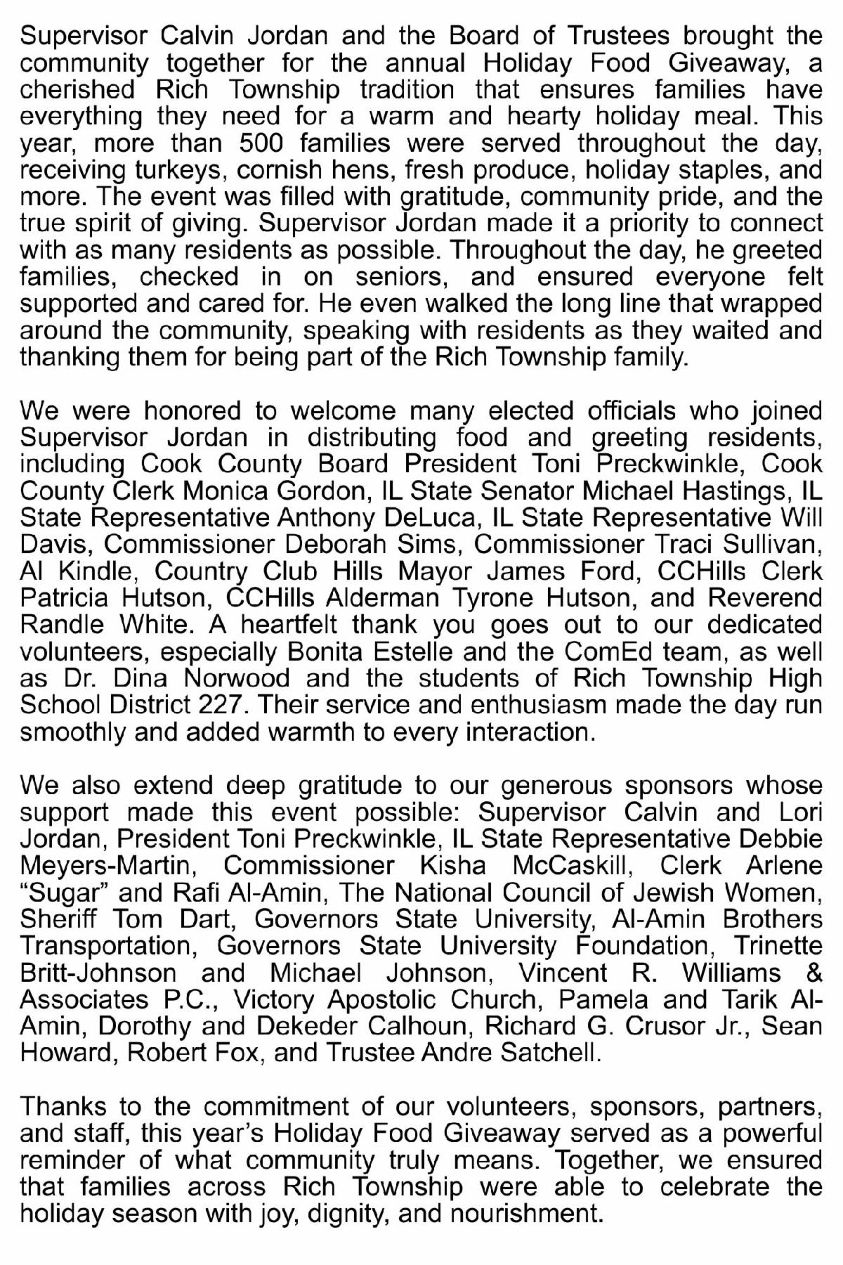 I am grateful for my entire Rich Township staff, our volunteers, and the community partners who continue to support our work. Each of you plays a part in moving this Township forward, and I do not take your dedication for granted.