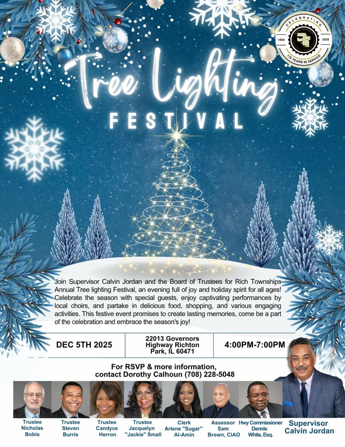 I would also like to remind everyone about one of my favorite traditions of the year. Our annual Tree Lighting Festival will take place on Friday, December 5, from 4:00 PM to 7:00 PM at Rich Township, 22013 Governors Highway. I look forward to seeing our families, children, and neighbors come together as we welcome the holiday season in unity and joy.