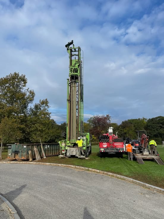 Image descriptions: 1 - The team drilling a test geothermal well at the Countryside School.