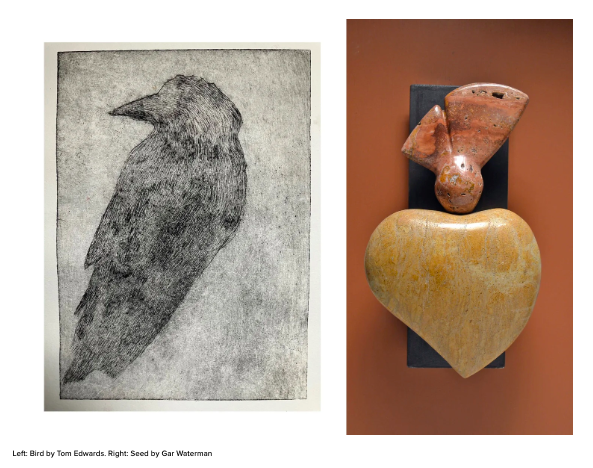 Tom Edwards exhibits a veritable aviary in our gallery this month with over 60 interpretations of BIRD that he has printed, drawn, painted or sculpted in response to personal encounters with winged creatures or in deep reverie of birds in nature, art, science and culture. For Gar Waterman, the form, function and strategy of seeds have provided a lifetime of fascination and in SEED, he has endeavoured to capture that moment of potential where biology, beauty, and imagination converge to translate nature’s quiet intelligence into stone.