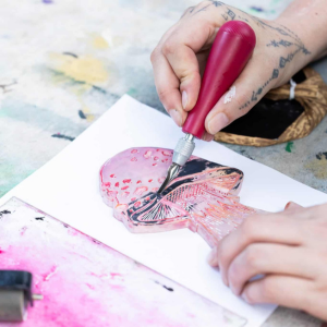 In this 1.5 hour workshop you will be guided through the basics of compositional design, block carving and printing. This fun hands-on workshop is geared towards ages 13 and up. Each participant will leave with unique prints and a reusable handmade stamp of their very own design. Small class size, registration required.