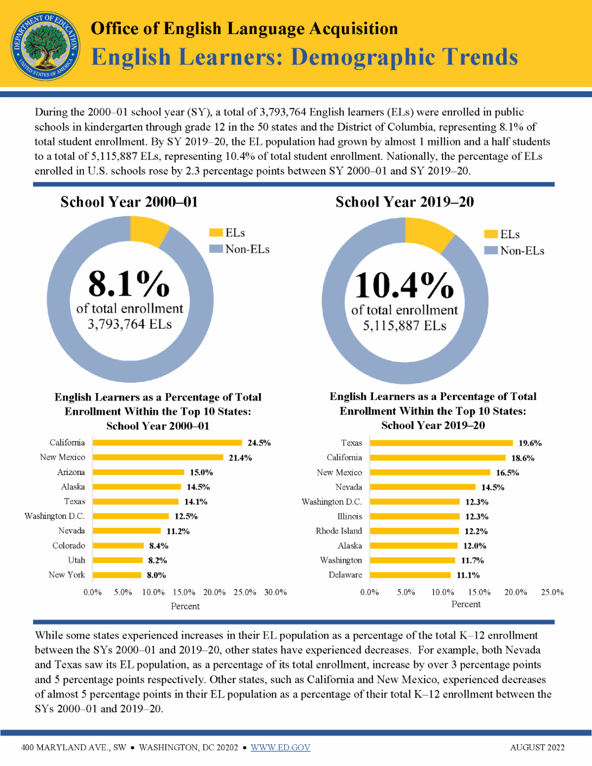 A new update to OELA’s fact sheet, ELs and Demographic Trends, provides student data from school year (SY) 2000–2001 and SY 2019–2020. During SY 2000–2001, a total of 3,793,764 ELs were enrolled in public schools in kindergarten through grade 12 in the 50 states and the District of Columbia, representing 8.1% of total student enrollment. By SY 2019–2020, the EL population had grown by almost one million and a half students to a total of 5,115,887 ELs, representing 10.4% of total student enrollment. Nationally, the percentage of ELs enrolled in U.S. schools rose by 2.3 percentage points between SY 2000–2001 and SY 2019–2020.