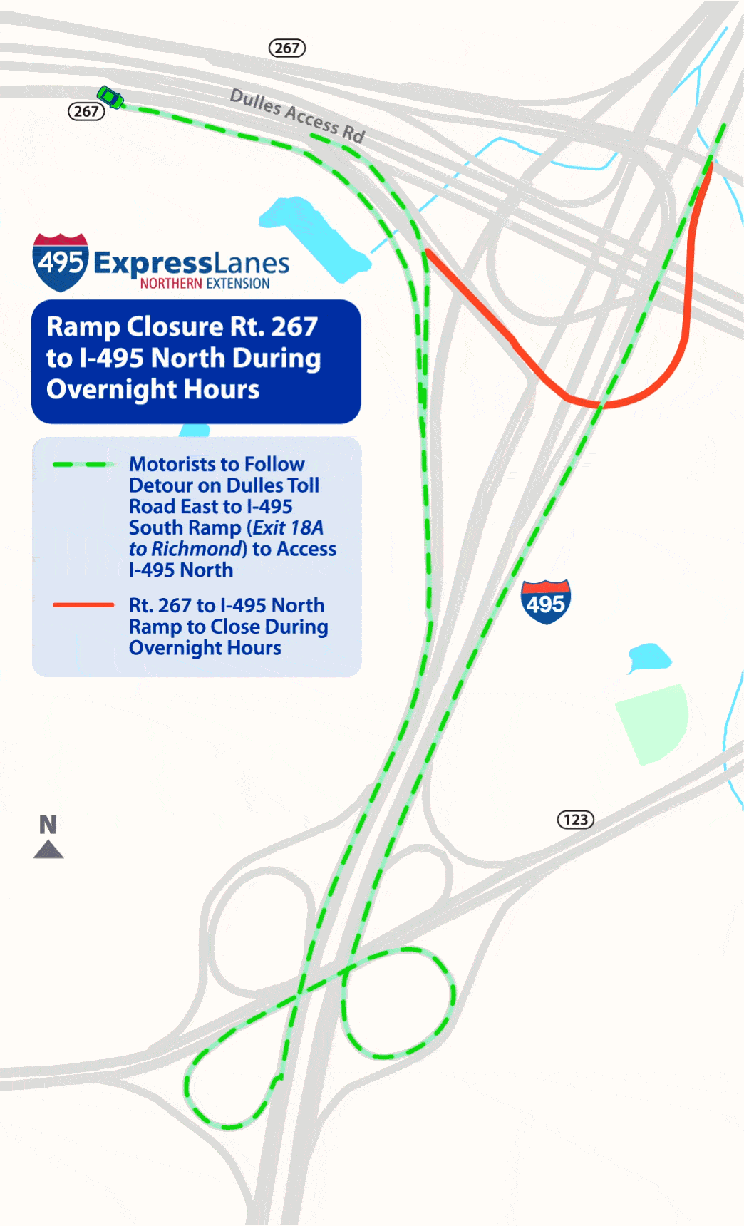 Drivers affected by the ramp closure from eastbound Dulles Toll Road/Airport Access Highway (Route 267) to northbound I-495 (Capital Beltway) should follow the posted detour: