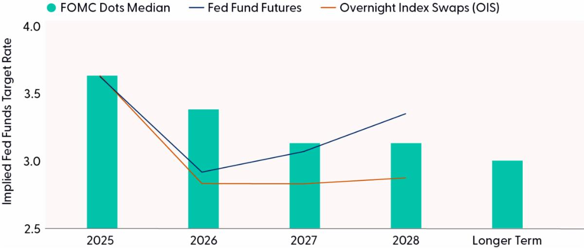 While the Federal Reserve’s latest dot plot signals only a modest pace of easing in 2026, markets are betting on a much steeper path of rate cuts. The September projections place the federal funds rate near 3.4% by year-end 2026, implying just one additional cut beyond 2025 levels. Futures markets, however, are pricing in multiple cuts, reflecting expectations that slowing growth and a softer labor market will compel the Fed to act more aggressively. This divergence underscores a fundamental debate: will inflation remain sticky or will disinflation and weaker demand dominate as markets seem to anticipate? The answer will shape the trajectory of monetary policy over the next two years. The gap between official guidance and market pricing underscores the uncertainty surrounding monetary policy in the coming years and highlights the risk of volatility if either side is proven wrong.
