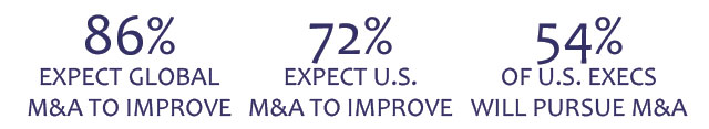 The polled executives are feeling good about the economy, with 96 percent in the U.S. indicating that economic conditions are stable or improving. They’re also optimistic about deal making, with 54 percent of the U.S. executives surveyed expecting to actively pursue M&A, a climb of 12 percent since October 2017. Also, 61 percent expect their pipeline of potential M&A deals in the next 12 months to grow, which is three times higher than the percentage reported one year ago.