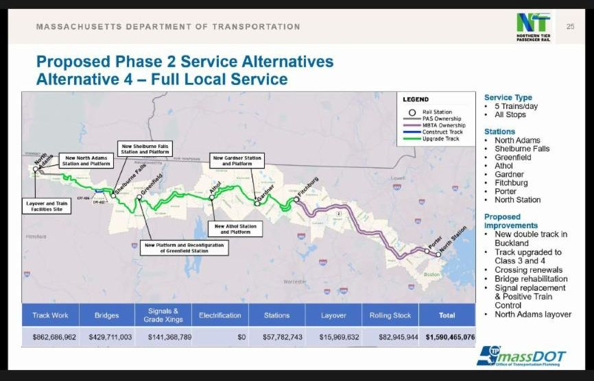MassDOT continues its work on the study of restoring passenger rail service along Route 2. We’re in the “bring-it-on-home” moment of this work. On October 26, MassDOT gave a formal public presentation on the six potential scenarios. At least two of these scenarios would be generational game changers for our region. Various proposals include stops in Shelburne Falls, Greenfield, and Athol, on the way to Porter Square in Cambridge and then North Station in Boston. (See below.) Proposals also include all-electric trains.