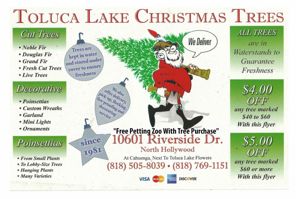 The 43rd annual Toluca Lake Christmas Tree lot is here! Get your Christmas trees, wreaths, centerpieces, garland and other holiday decorations. Serving the community since 1946! More>>