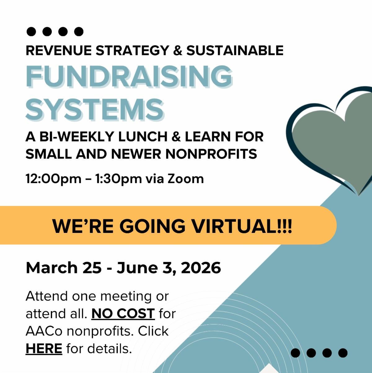 We recognize that nonprofit leaders need more flexible options, so we're pleased to announce that the F&S cohort content for small and newer nonprofits will now be available in a Lunch & Learn webinar format. The series is free for AACo nonprofits.