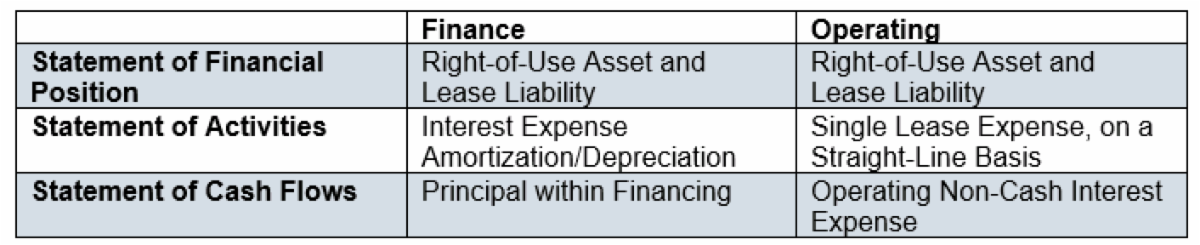 Below is a table to show where each type of lease, finance and operating, need to be shown in the financial statements: